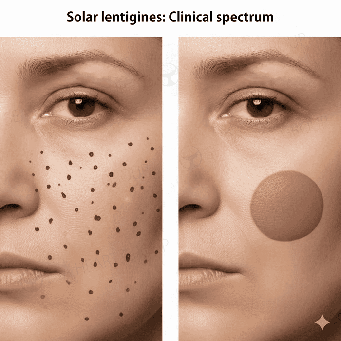 Sun spots are among the most common pigmentary lesions treated in aesthetic clinics. Medically, they are referred to as solar lentigines, also known as actinic lentigines or age spots (lentigo senilis).