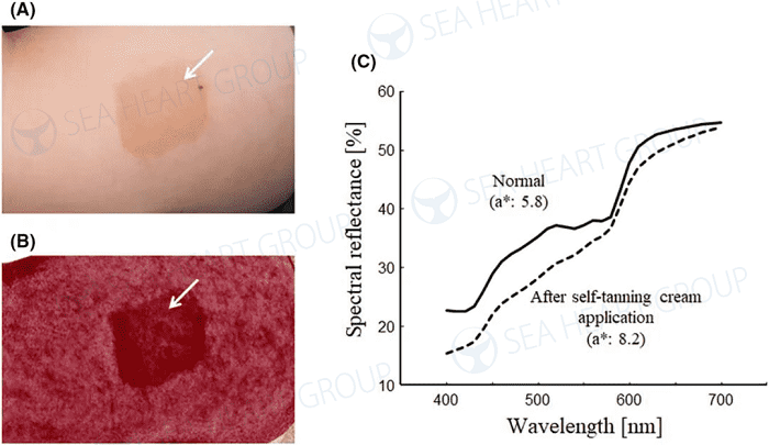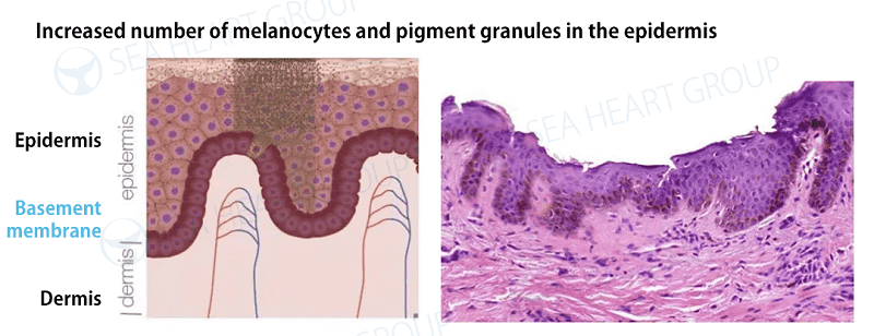 Long-term sun exposure not only stimulates melanin production but also causes dermal vascular dilation, resulting in visible or subclinical erythema beneath the pigment lesion.