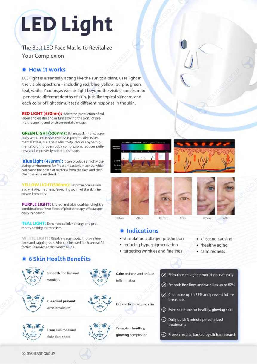 LED Light Therapy: Targets acne, inflammation, and pigmentation using different wavelengths.